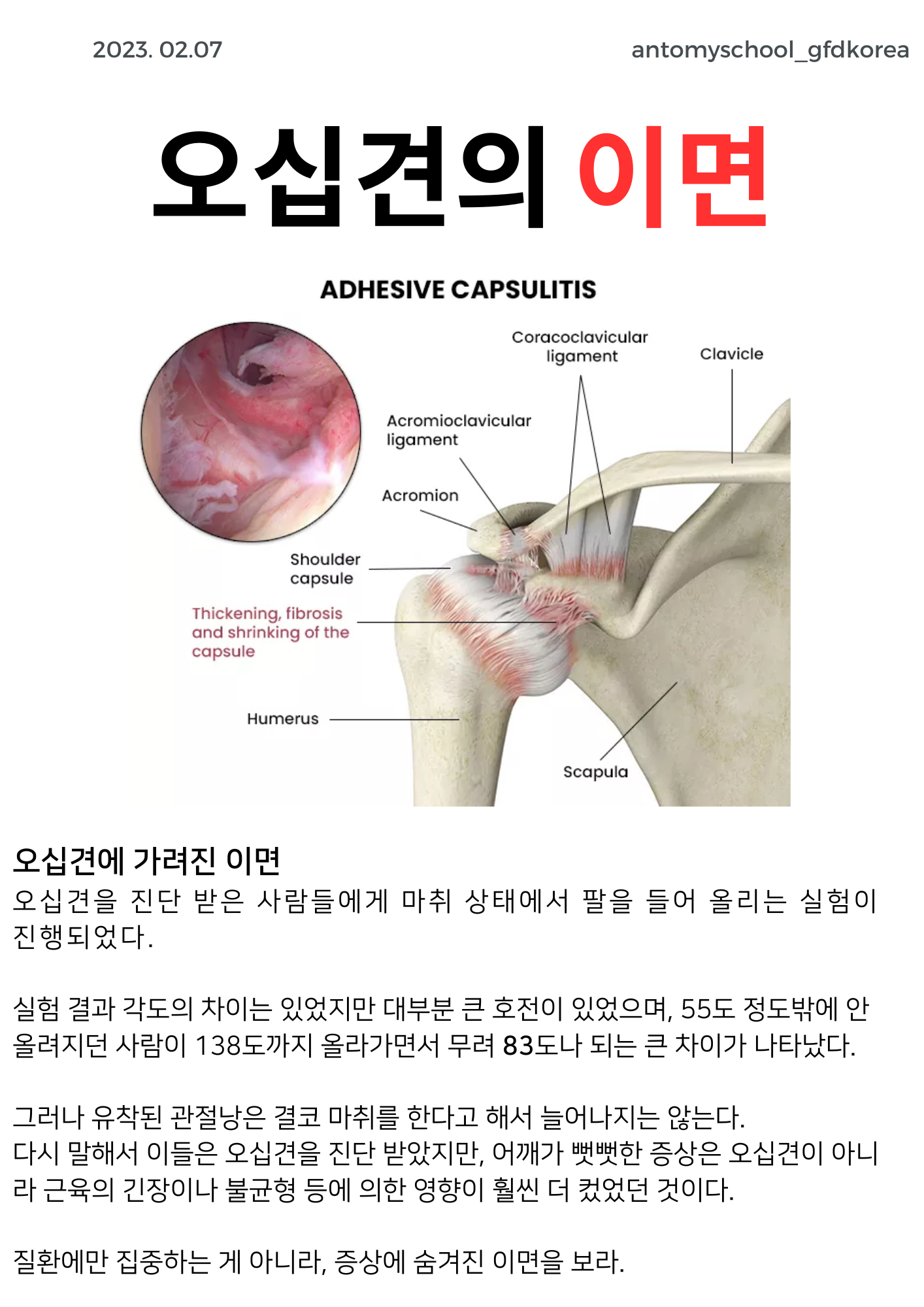 건강 오십견의 이면 By 장소영 기자 - 2024년 2월 7일 0 142 Facebook Twitter Pinterest WhatsApp 여러분들은 오십견(유착성관절낭염)을 진단받은 사람들에게 어떻게 접근하시나요? 오십견(유착성관절낭염)은 어깨 통증 뿐만 아니라 어깨 전반에 나타나는 극심한 가동범위제한이 특징입니다. 그런데 어깨가 뻣뻣해지는 증상이 정말 오십견(유착성관절낭염)에 의한 것일까요? 재미있는 연구를 가져왔으니, 관심 있는 분들은 보시면 좋을 것 같습니다. 질환에 숨겨진 이면을 바라보실 수 있기를 희망합니다.